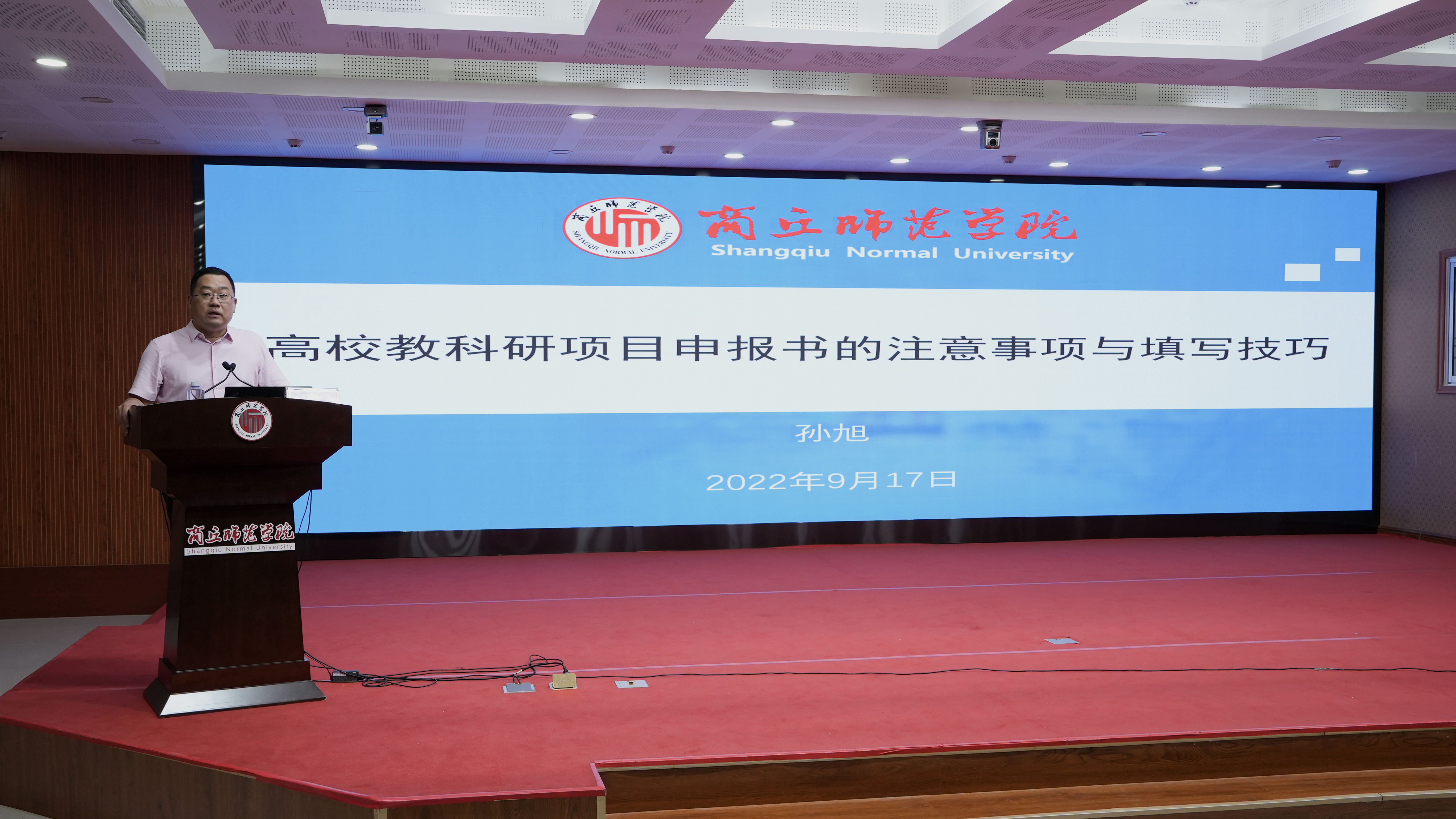 教师教育学院院长孙旭以《高校教科研项目申报书的填写技巧与注意事项》为题作了专题报告,他以不同项目类型具体申报材料为依据,从课题标准、申请书内容以及申请书具体填写规范与要求等角度,逐一展开进行细致的介绍与指导。