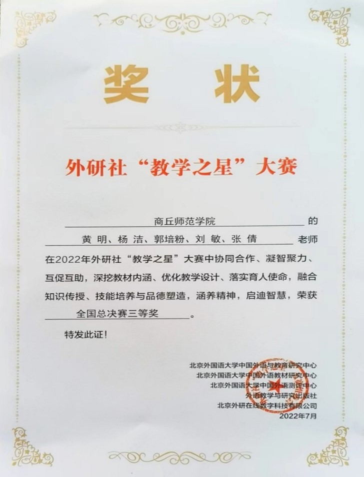 2022年7月外研社“教学之星”大赛在云端落下帷幕,外语学院黄明教师团队经过层层选拔,最终取得了全国半决赛二等奖、全国总决赛三等奖的好成绩,该成绩为本项国家级教学竞赛自新葡的京集团35222vip外语学院参赛以来的最好成绩。