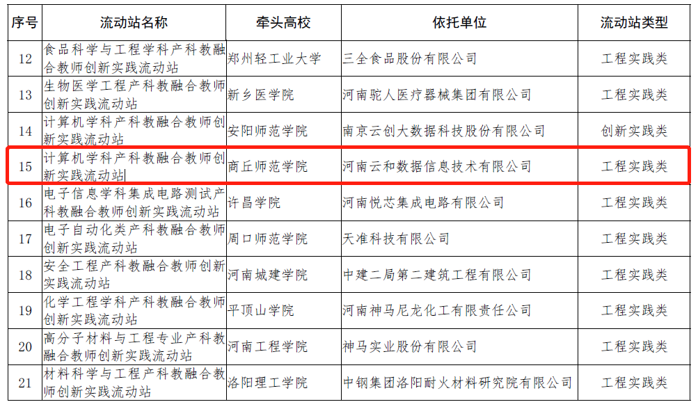 近日,河南省教育厅发布《河南省教育厅关于公布河南省本科高校产科教融合教师创新实践流动站建设的通知》教高【2023】112号,新葡京官网与河南云和数据信息技术有限公司联合申报的“计算机学科产科教融合教师创新实践流动站”获批。