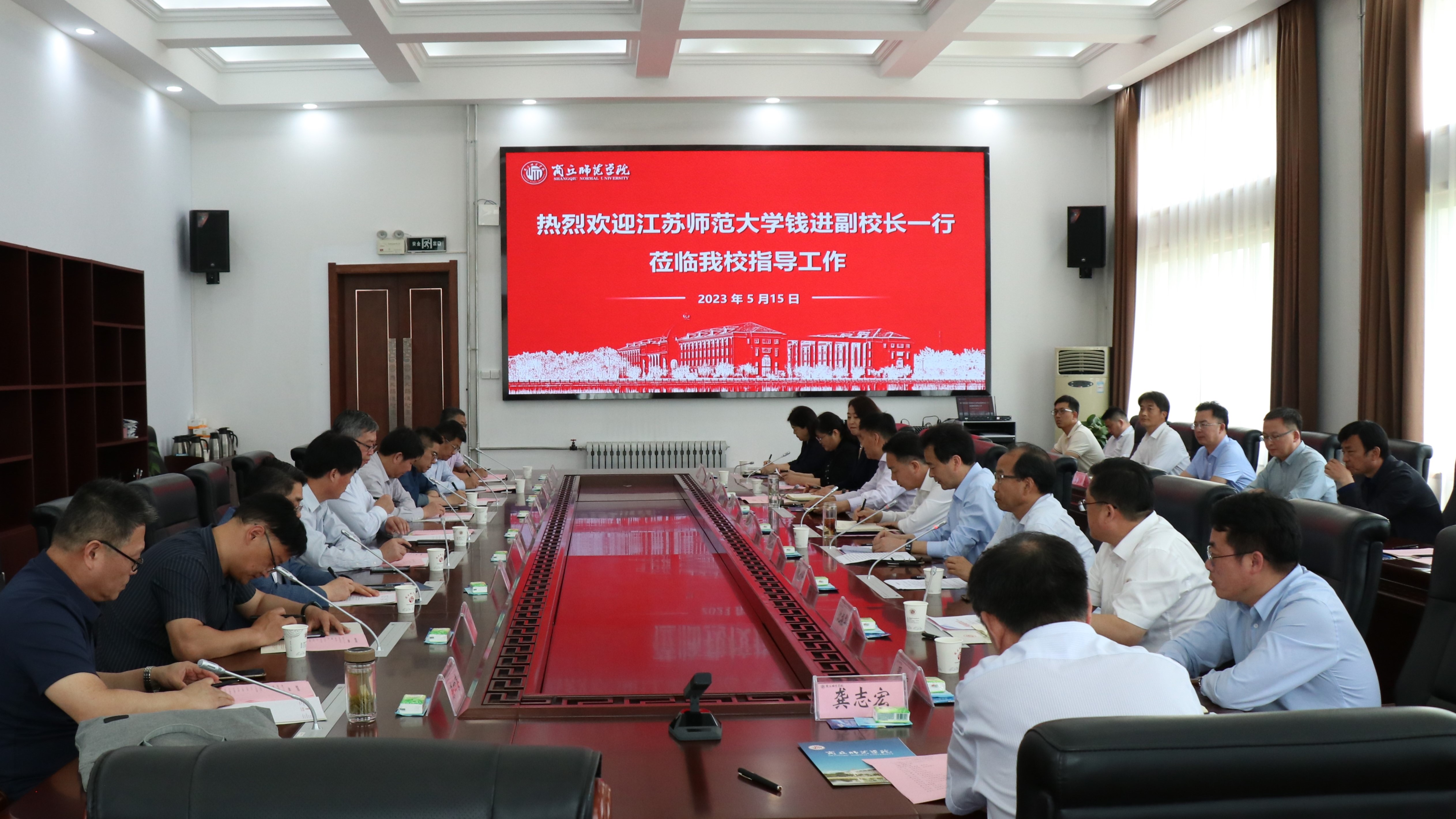 5月15日上午,江苏师范大学党委常委、副校长钱进一行来新葡京官网开展师范教育协同提质计划目标任务推进工作,江苏师范大学党委组织部、校长办公室、教务处、人事处等职能部门负责人和挂职干部陪同交流。新葡京官网党委书记张志坚、校长陈向炜、校党委副书记吴金山、副校长郭文佳,以及相关职能部门负责人及相关学院党政负责人出席座谈会。座谈会由副校长郭文佳主持。