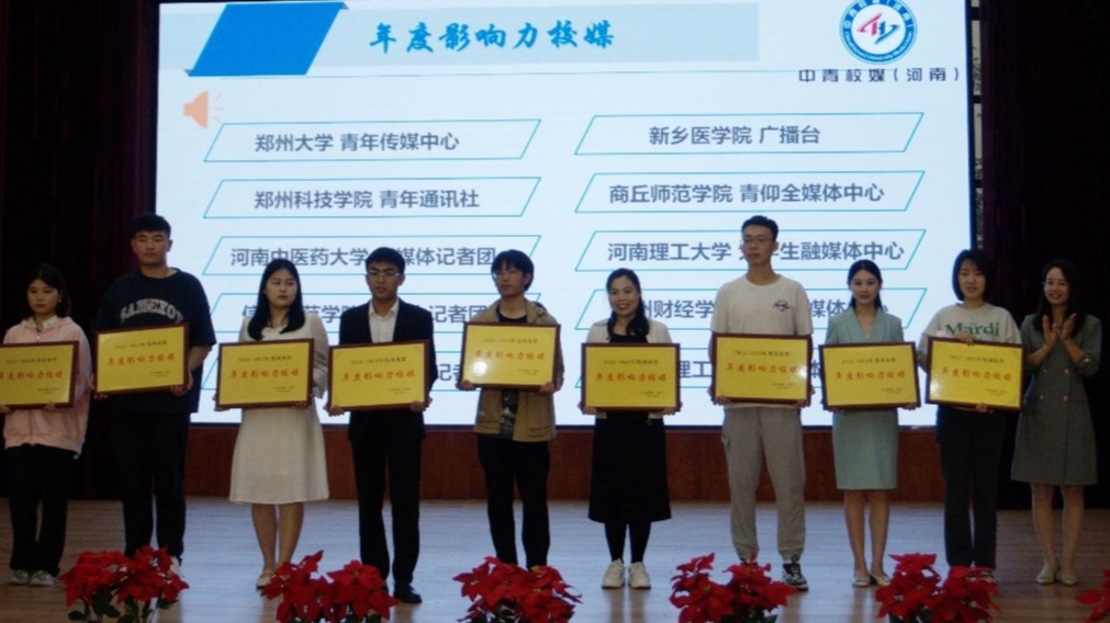 5月27日,2023年中青校媒(河南)年会暨第十五届主席团换届大会在郑州财经学院举行,年会上公布了2022—2023年度河南省年度影响力校媒、优秀指导老师、优秀校媒人等奖项获奖名单。新葡的京集团35222vip青仰全媒体中心获评“年度影响力校媒”奖,青仰全媒体中心指导老师张颖辉获评“优秀指导老师”称号,青仰全媒体中心成员、人文学院学生王艺获评“优秀校媒人”称号,青仰全媒体中心成员、法学院学生张鑫雨当选为中青校媒(河南)第十五届主席团成员。
