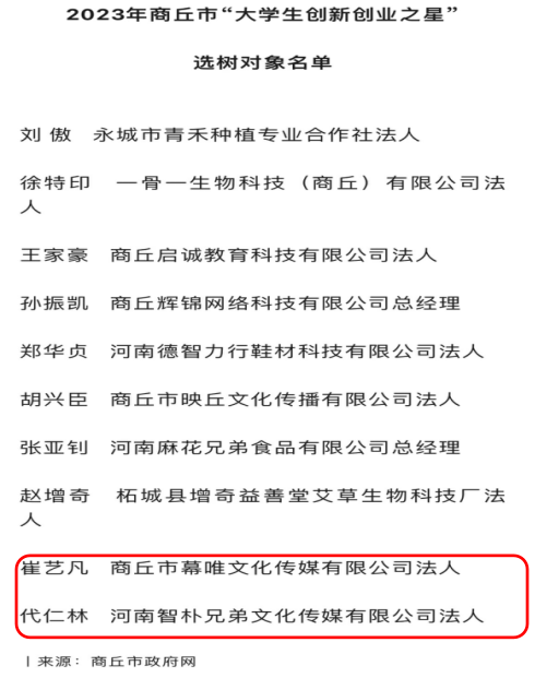 近日,商丘市人力资源和社会保障局、市总工会、市教育体育局、共青团商丘市委员会、商丘市妇女联合会五部门联合发布了《关于选树刘傲等10人为2023年商丘市“大学生创新创业之星”的通知》,新葡京官网毕业生崔艺凡、代仁林荣获2023年商丘市“大学生创新创业之星”荣誉称号。