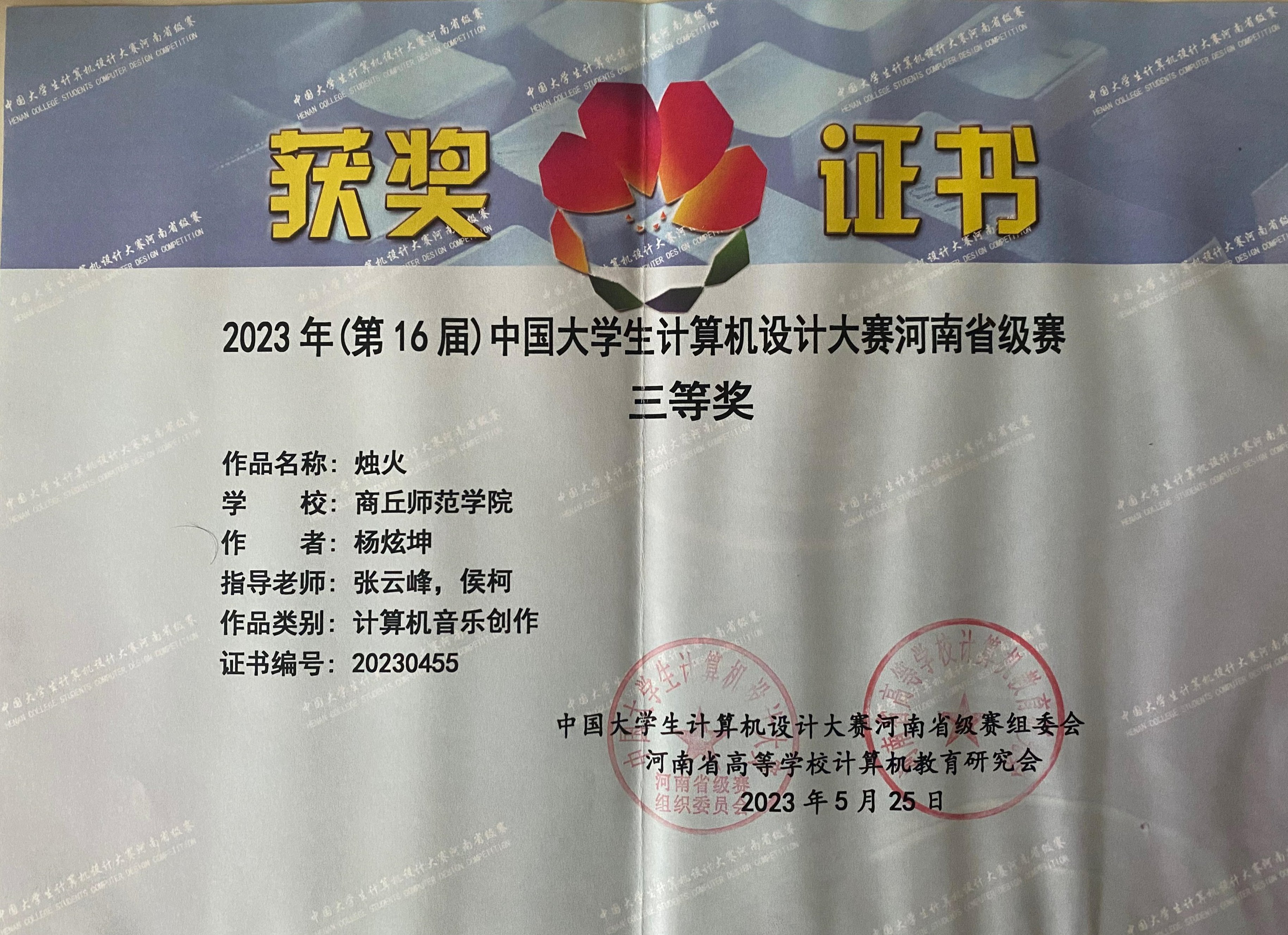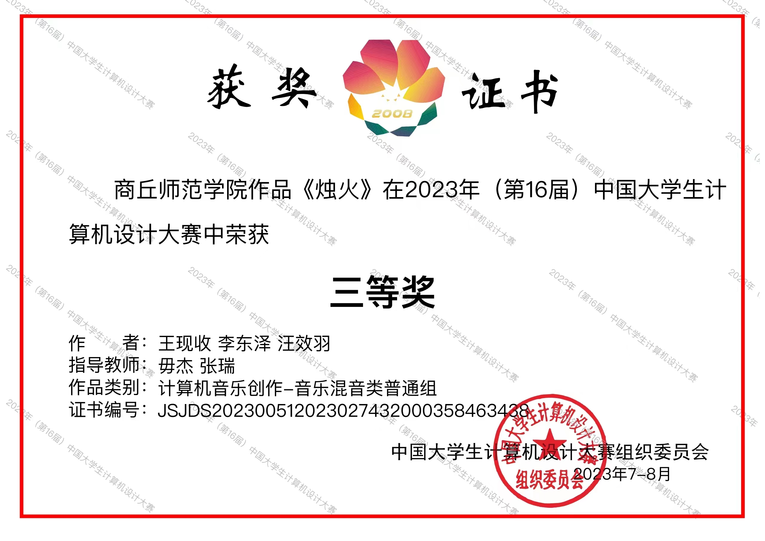 近日,2023(第16届)中国大学生计算机设计大赛全国总决赛圆满结束,由新葡的京集团35222vip音乐学院毋杰、张瑞老师指导,王现收、李东泽、王效羽三名同学所创作的参赛作品《烛火》获得计算机音乐创作(音乐混合类)全国总决赛三等奖。由张云峰、侯柯老师指导,杨炫坤同学所创作的参赛作品《烛火》获得计算机音乐创作(音乐混合类)河南省三等奖。