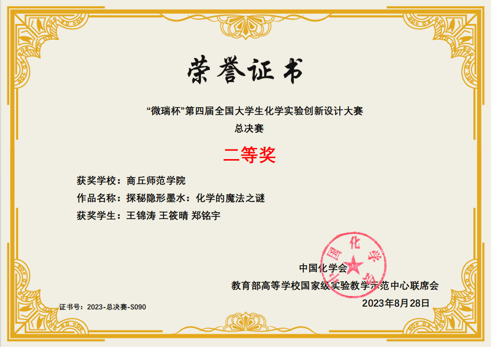 科普实验项目“探秘隐形墨水:化学的魔法之谜”,经过指导老师的精心指导并不断打磨优化,凭借巧妙的创意和精彩的阐释荣获全国总决赛二等奖。这是新葡京官网学子在此项赛事的又一次国家级奖项,展现了新葡京官网学子扎实的理论知识、实验技能和较强的创新能力。