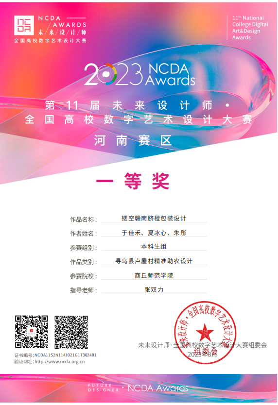 近日,2023第11届未来设计师全国高校数字艺术设计大赛(NCDA)河南赛区发布获奖通知,新葡京官网艺术设计学院共有十余项作品获奖,其中学生一等奖1项、二等奖4项、三等奖6项,20级视觉传达专业学生于佳禾、夏冰心、朱彤三位同学的包装设计作品“镂空赣南脐橙包装设计”在本次大赛中荣获一等奖。
