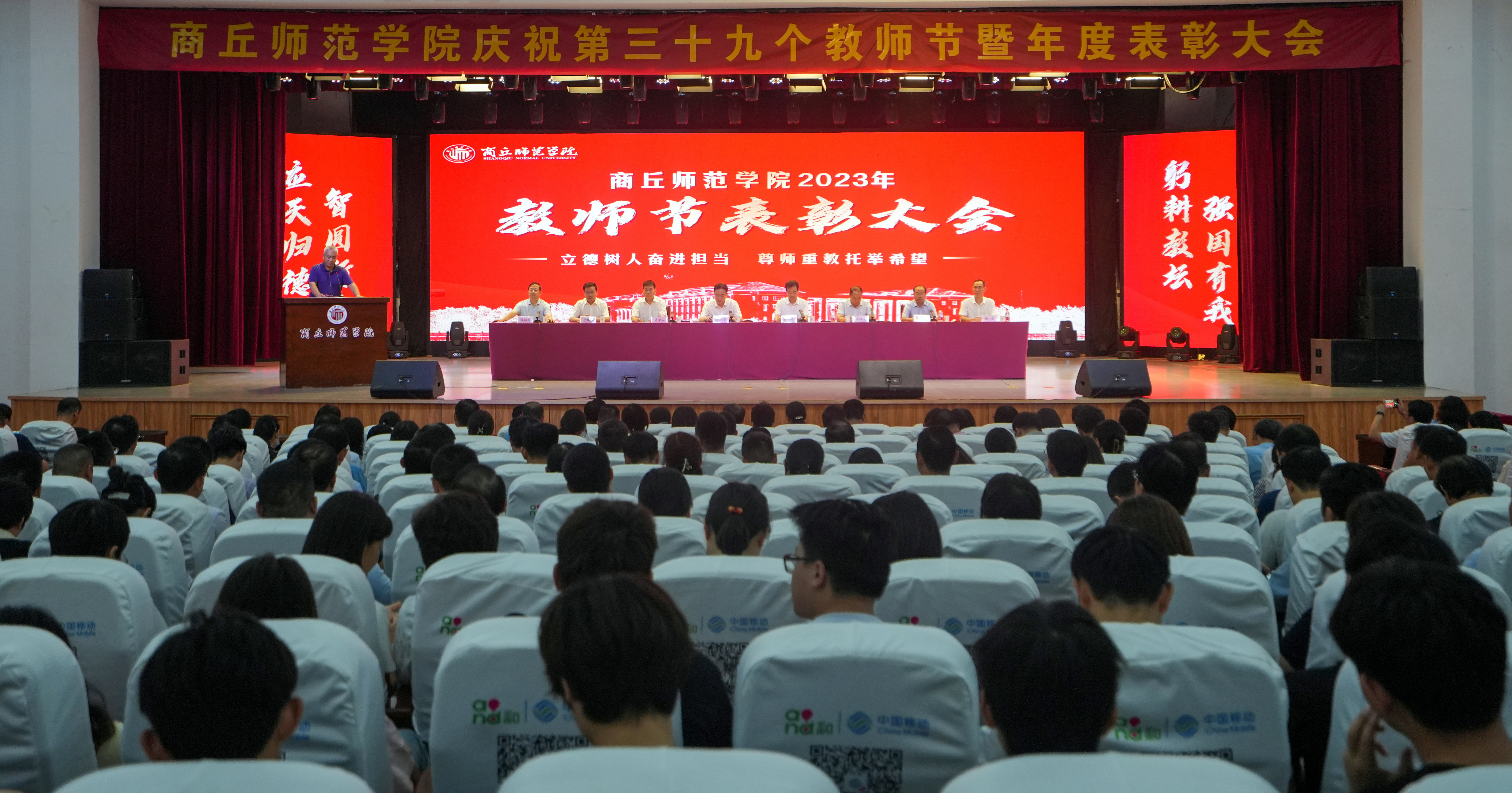 9月8日,新葡京官网在睢阳校区大礼堂召开教师节表彰大会,庆祝第39个教师节。全体校领导、校内各单位党政负责人,2022-2023学年在师德师风、教育教学、科学研究、管理服务等工作取得突出成就的教师、“从教满30年教师”和部分教师代表、学生代表共700余人参加会议。党委副书记、校长陈向炜主持会议。