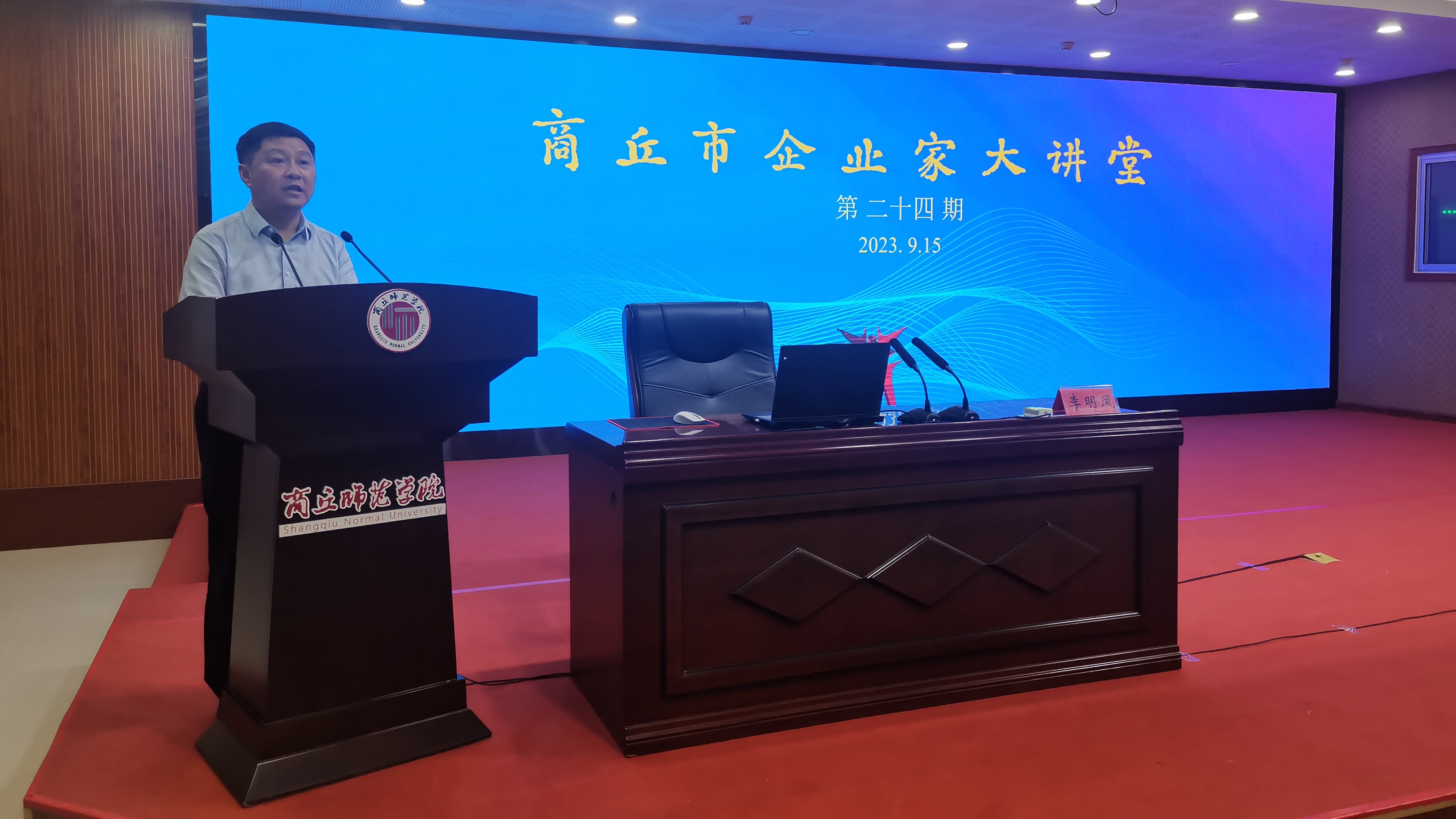 9月15日,第二十四期商丘市企业家大讲堂在新葡京官网三商楼报告厅举行。新葡京官网党委副书记吴金山、副校长程功鹏、有关部门负责人及教师代表,市委有关部委、市直有关单位主要负责同志,夏邑县、示范区企业家代表等在主会场参加会议,商丘各县(市区)设立分会场观看直播视频。会议由商丘市政府副秘书长闫辉主持。