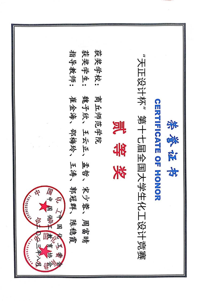 近日,由中国化工学会、中国化工教育协会主办的“天正设计杯”第十七届全国大学生化工设计竞赛圆满落幕。新葡京官网化学化工学院2021级本科生魏子欣、王云正、孟哲、宋少蓉、周富晴组成的代表队经过激烈角逐,荣获二等奖。