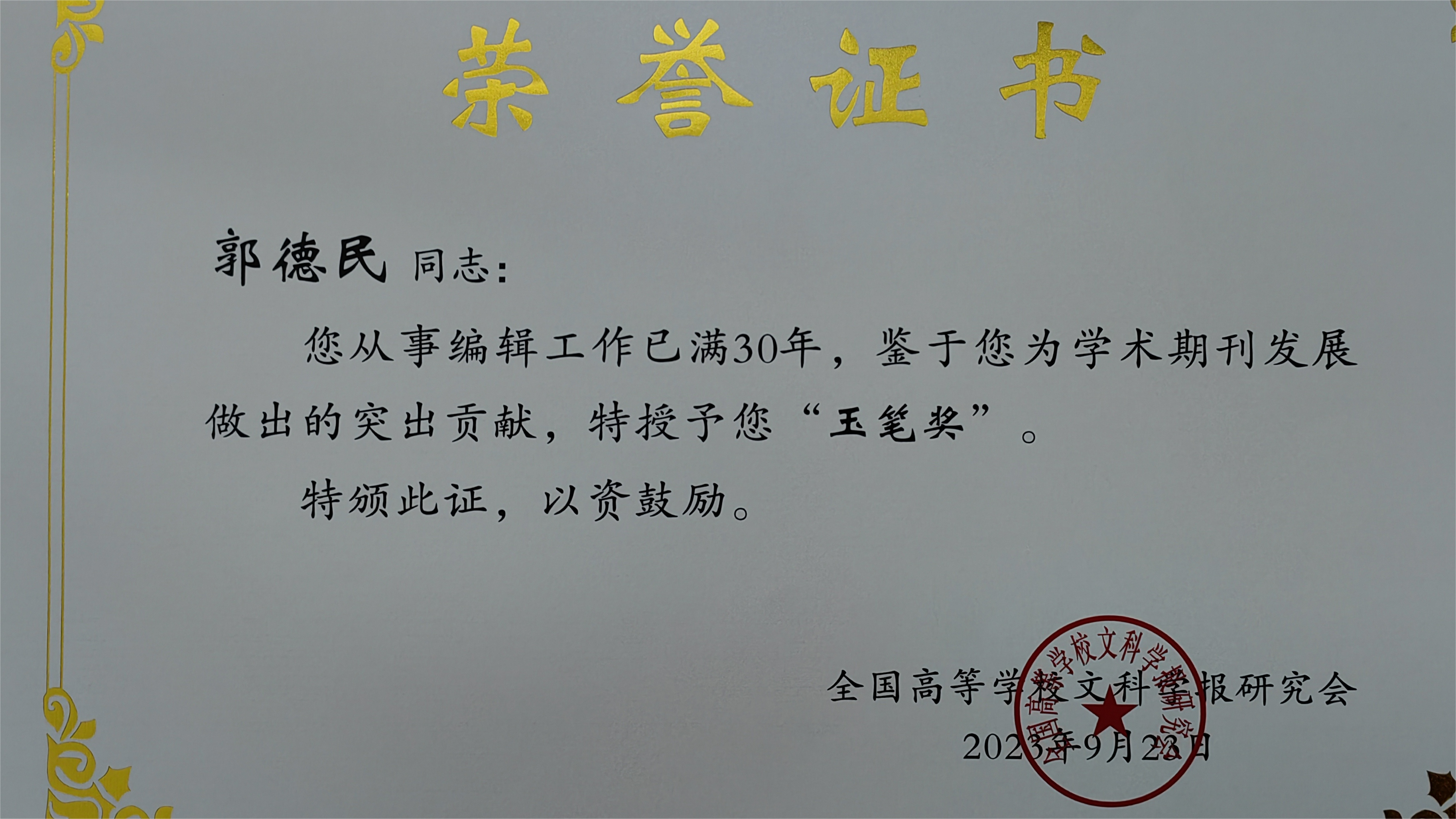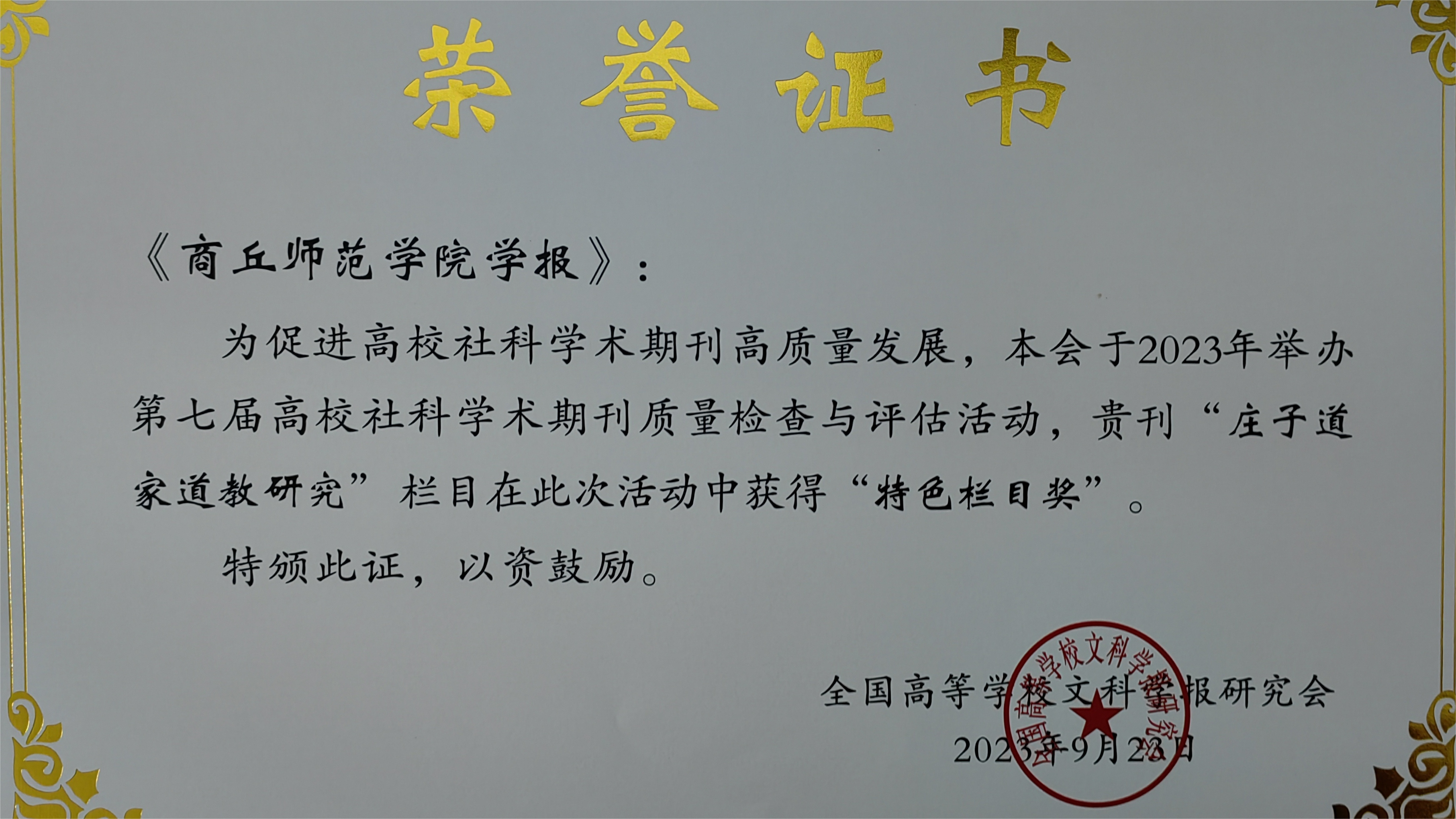 会上,第七届高校社科学术期刊质量检查与评估结果予以公布,新葡京官网学报“庄子·道家·道教研究”栏目获得“特色栏目奖”,编辑部郭德民同志获得“玉笔奖”。