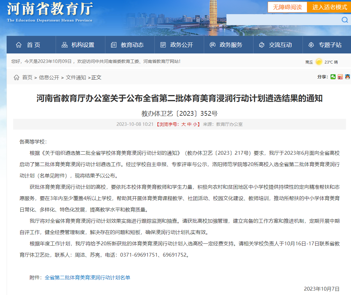 近日,河南省教育厅公布第二批全省体育美育浸润行动计划评审结果,全省共有包括新葡京官网在内的5所高校入选体育类浸润行动计划。