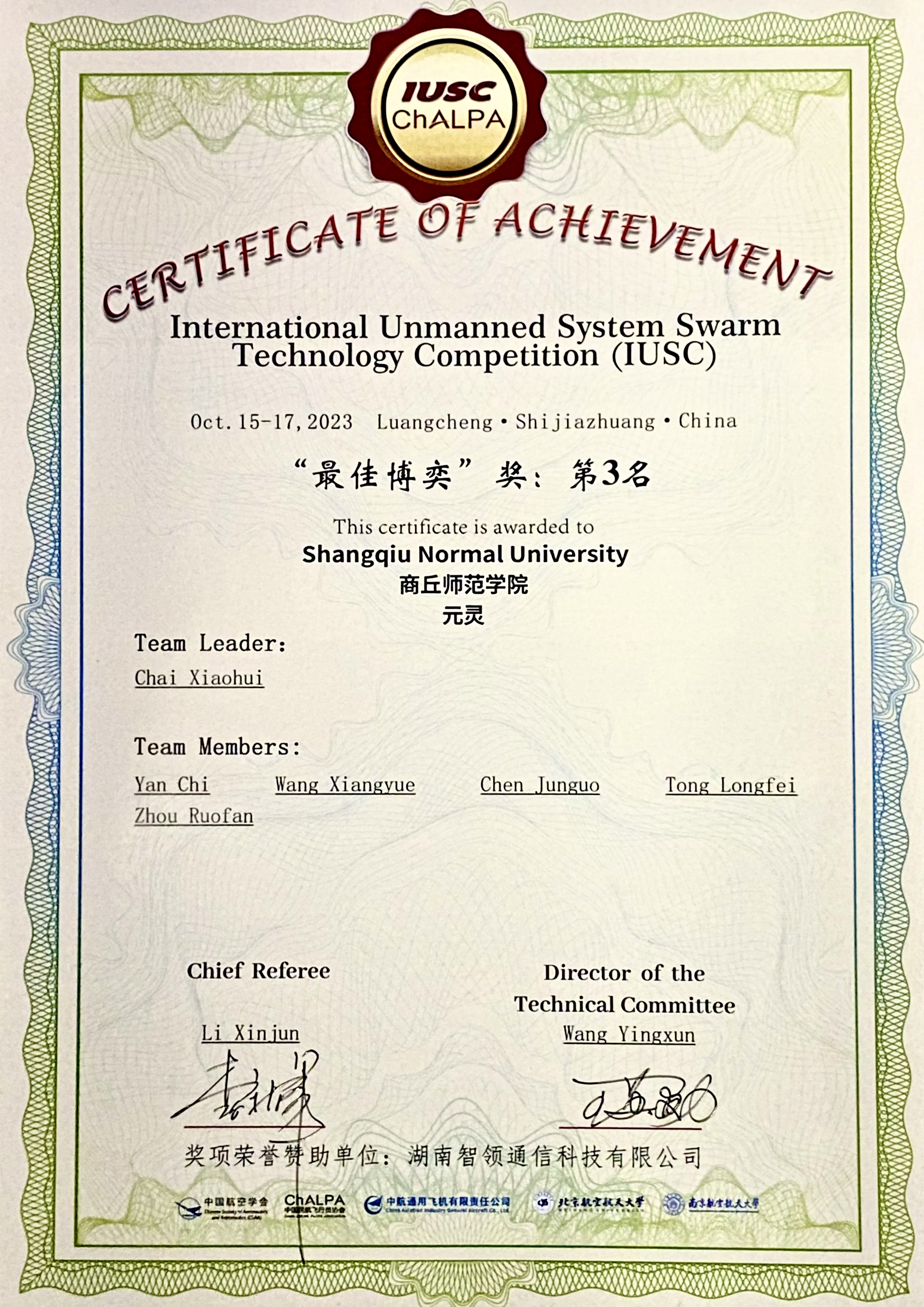 10月15-17日,栾城杯“智领群蜂2023”无人蜂群创新技术大赛室外赛暨中国民航飞行员协会(ChALPA)首届无人机职业技能大赛在河北省石家庄市栾城区举行。大赛由中国航空学会、中国民航飞行员协会、中航通用飞机有限责任公司、北京航空航天大学、南京航空航天大学联合主办,石家庄市栾城区人民政府等单位承办。