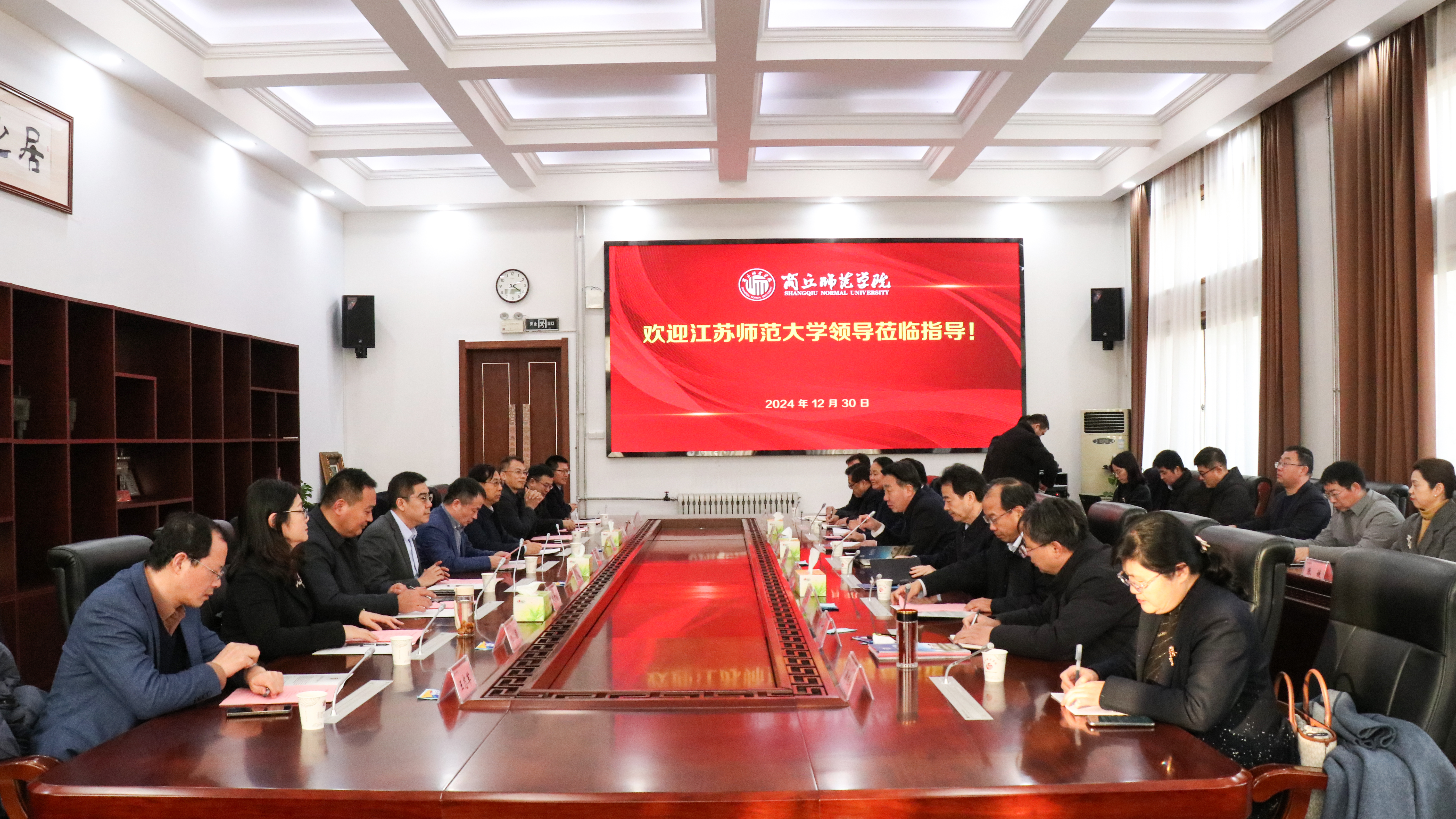 12月30日,江苏师范大学党委书记芮国强,校长杜增吉,副校长赵鹏一行来校指导师范教育协同提质计划工作,江苏师范大学党委组织部、校长办公室、教务部、人事处等职能部门负责人陪同交流。校党委书记张志坚,校长陈向炜出席会议。会议由校党委书记张志坚主持。