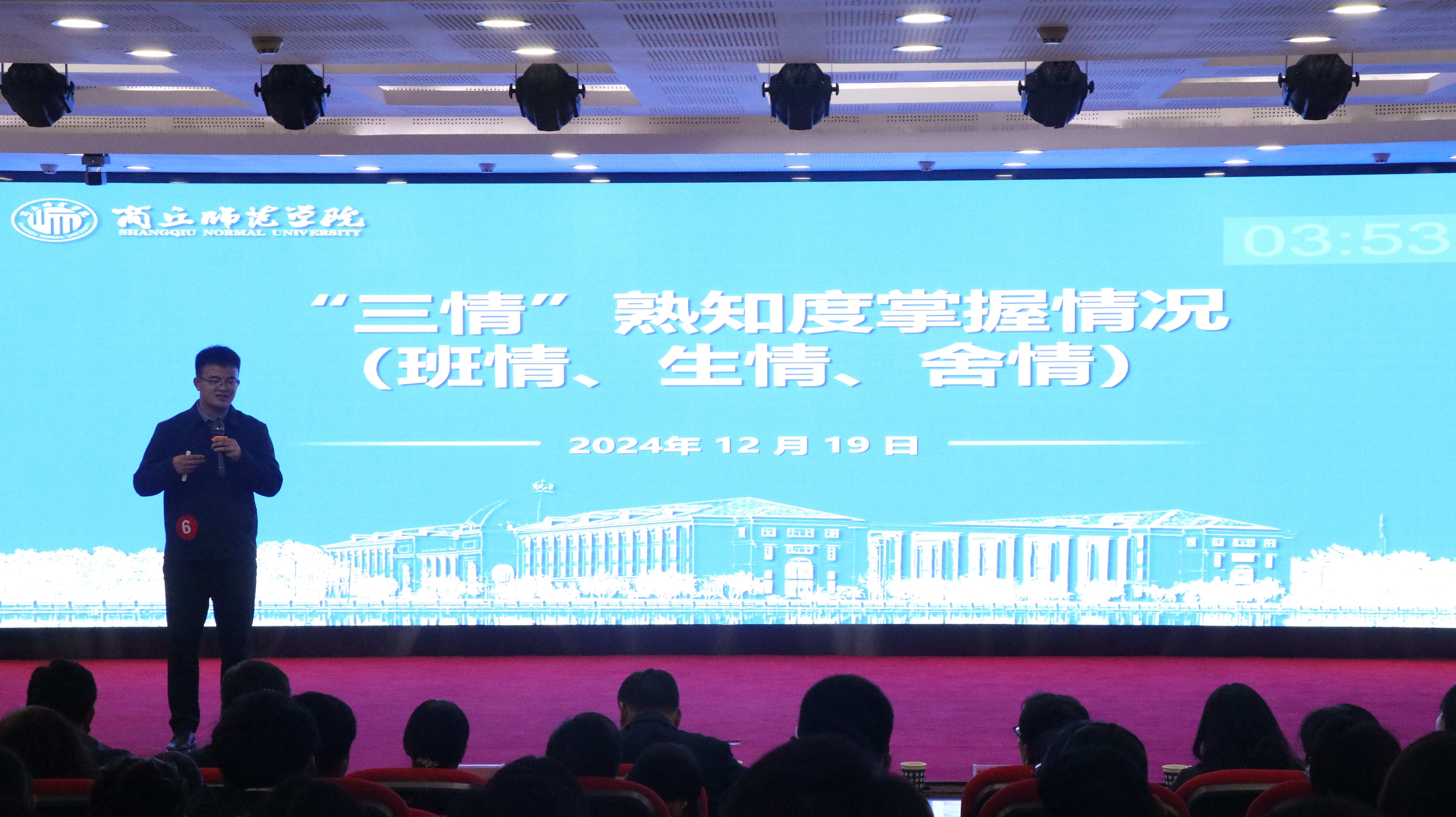 在“三情”熟知度(班情、生情、舍情)测验环节,随机抽取学生信息,围绕学生家庭籍贯、宿舍信息、兴趣特长等进行现场问答,全面考察辅导员、班主任对学生基本情况的熟知程度。辅导员、班主任队伍守护在学生健康成长的一线,是学校落实立德树人根本任务的急先锋、主力军,责任重大、使命光荣。