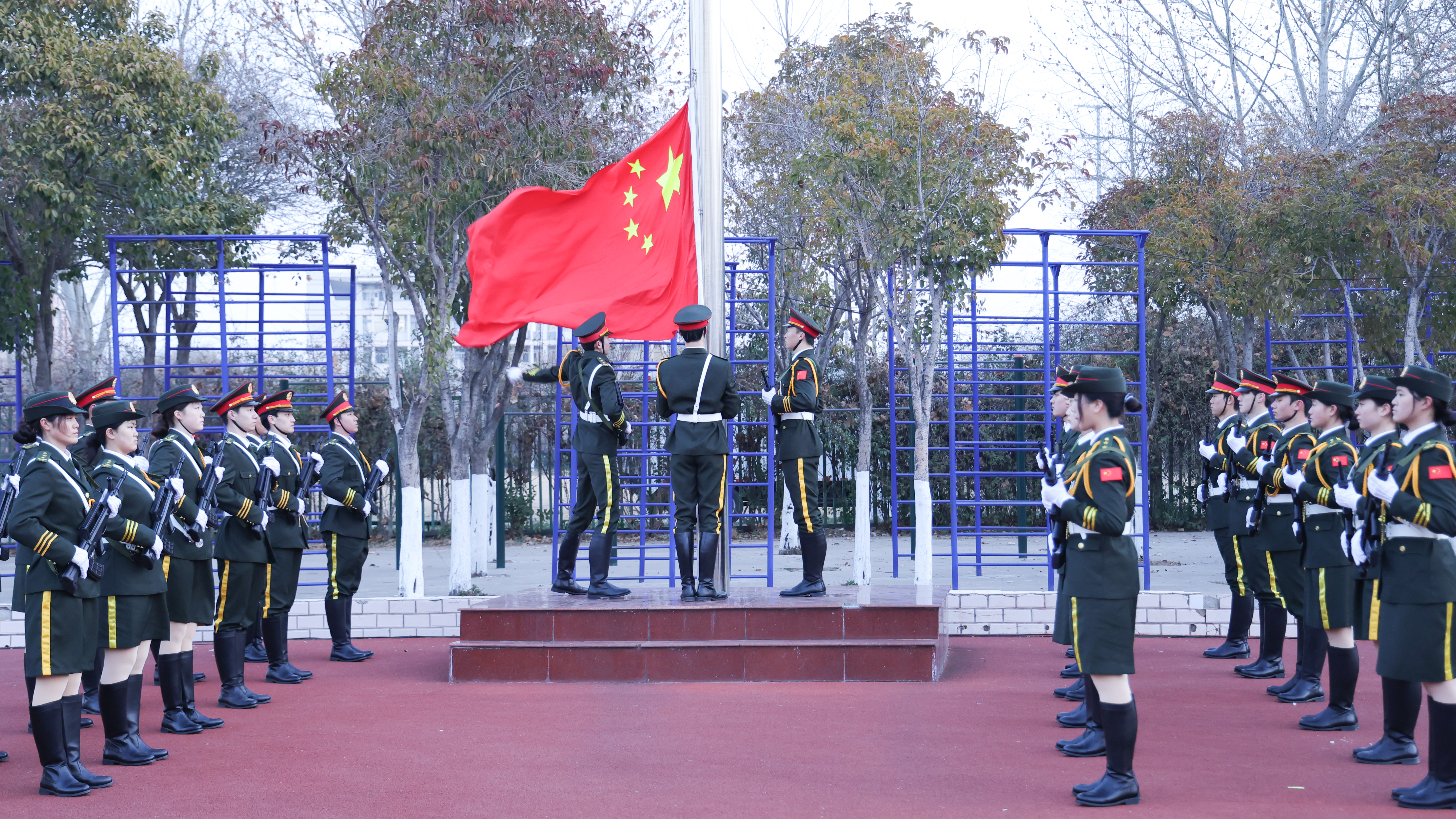 上午7时,国旗护卫队迈着铿锵有力的步伐,护送国旗入场。伴随着激昂的《义勇军进行曲》,鲜艳的五星红旗冉冉升起,全体师生肃立,行注目礼。