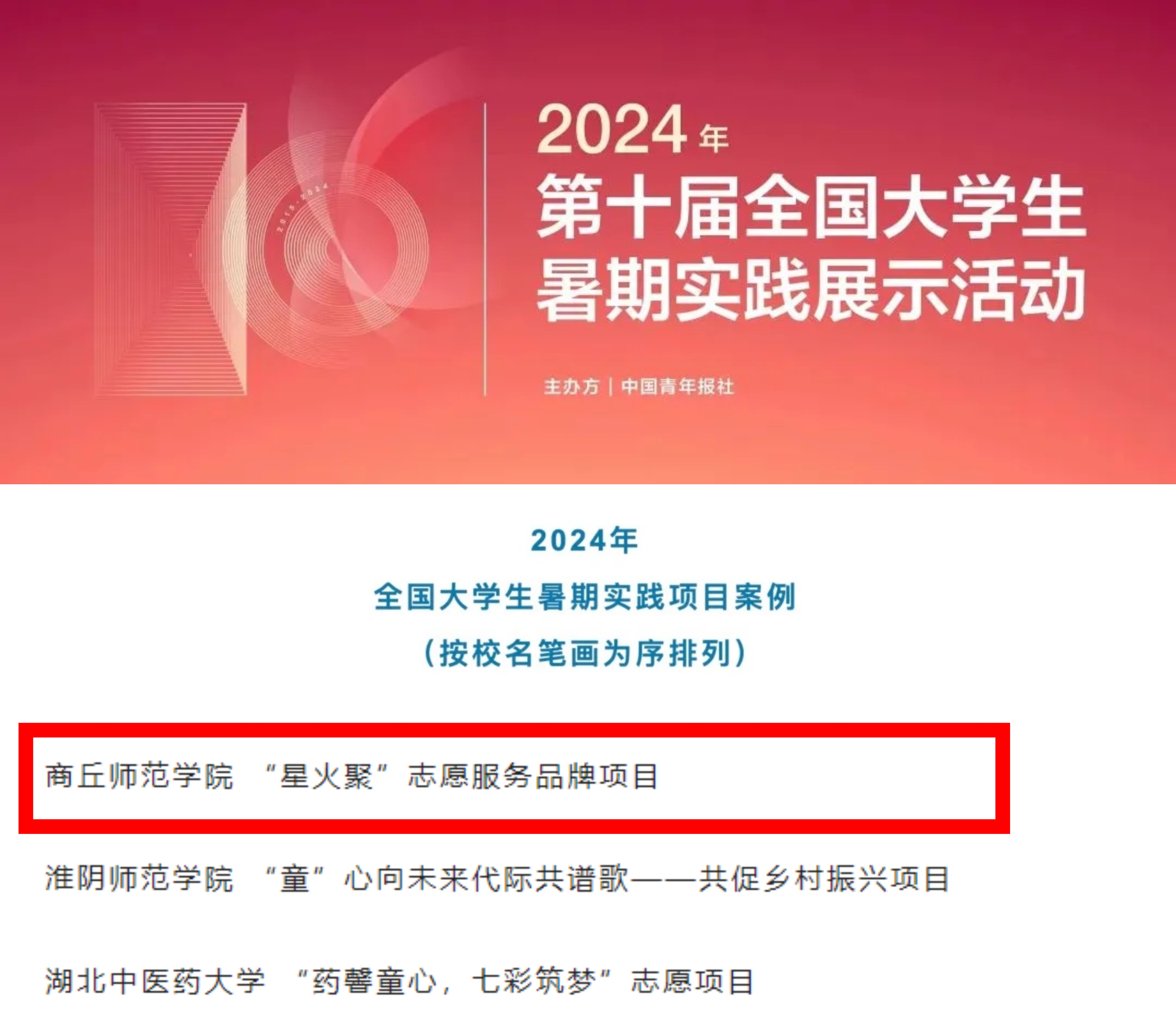 近日,由中国青年报社举办的第十届全国大学生暑期实践展示活动落下帷幕,经校方推荐、团队自荐、网络展示等环节,新葡京官网“星火聚”志愿服务品牌项目从1805个入围项目中脱颖而出,获评全国百强优秀实践项目。